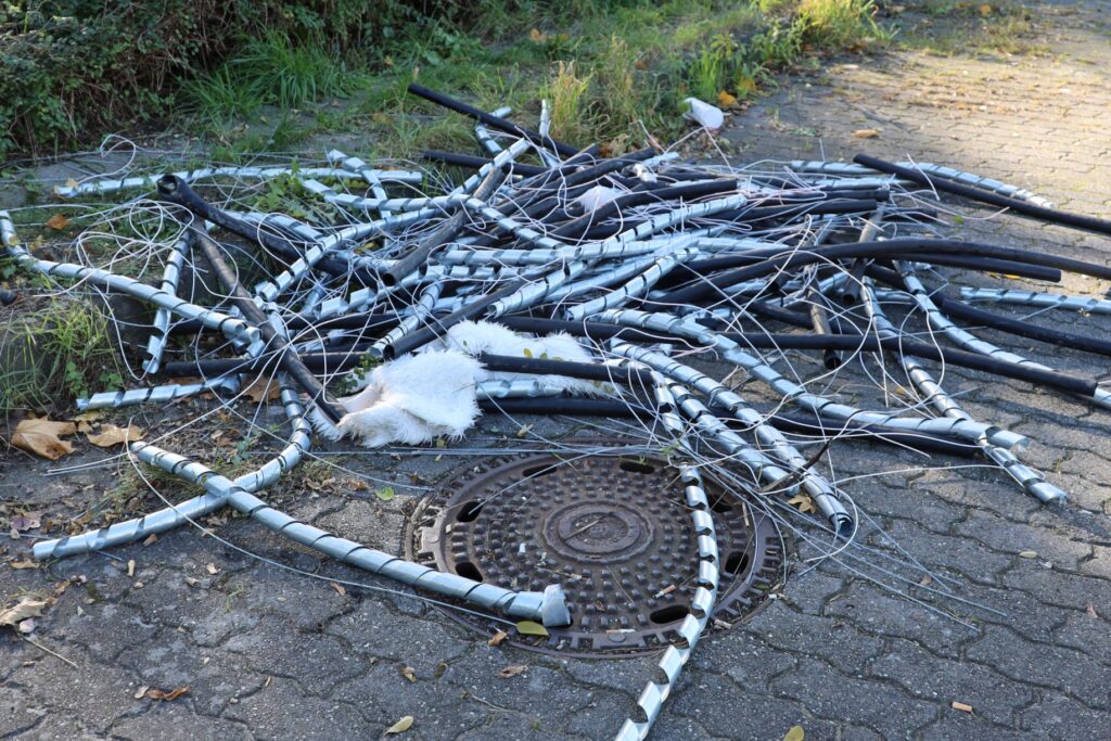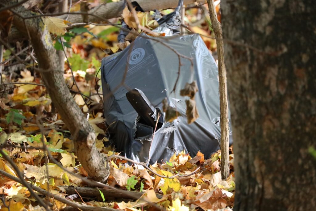 2 Trockenbatterien, 5 Autoreifen, 2 Einkaufswagen, Weihnachtsbaum, Feuerlöscher, Blumentopf, Presspappe, MP3-Player, Eimer, CDs, Holzbeetumrandung, kaputtes Wurfzelt, verschiedene Fahrradteile, mehrere Mayonnaiseeimer in blauen Säcken (vermutlich von einem Imbiss), Holztüren, Bretter, kaputtes Fahrradschloss, Geschmack für Vape mit Verpackung, Beißring für Baby, viel Kabelisolierung, Plastikschiene, viele Windeln, Trolley, Teile eines E-Rollers, verschiedene Schuhe und Kleidung, hunderte abgebrannte Teelichter, unzählige Taschentücher, Plastikfolien, Verpackungen von Schokoriegel & Co., Glasflaschen, Metallschrank, Getränkedosen, Kabel, verschiedene Plastikrohre, Bauschutt, Katzenstreu, Baugerüststange, Kaffee-to-go-Becher, Mütze und eine leere Geldkassette versteckt unter Laub.