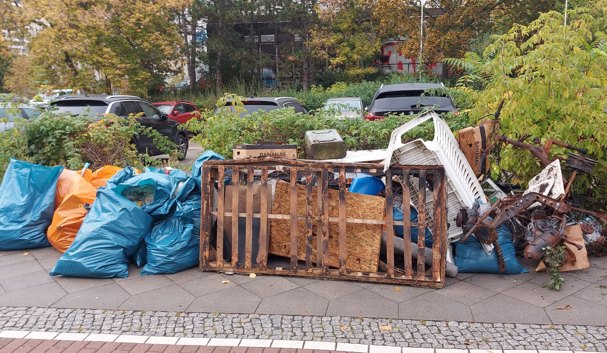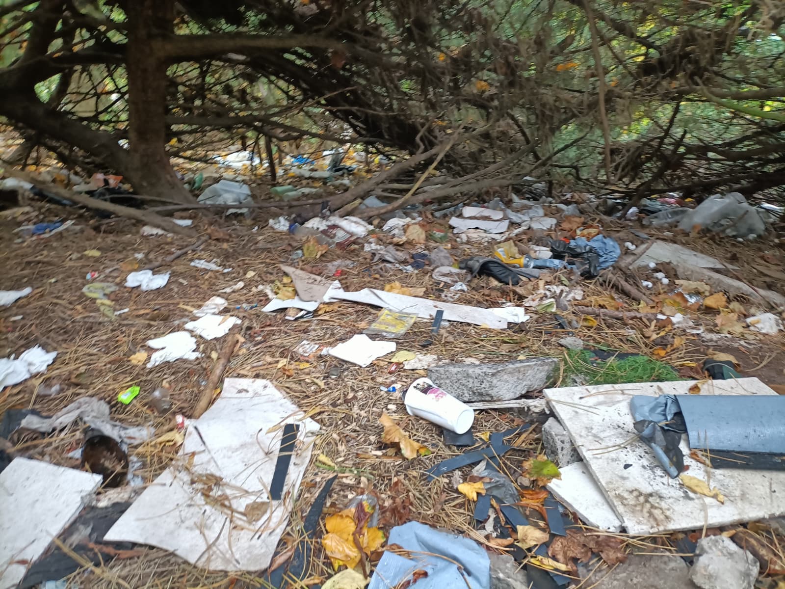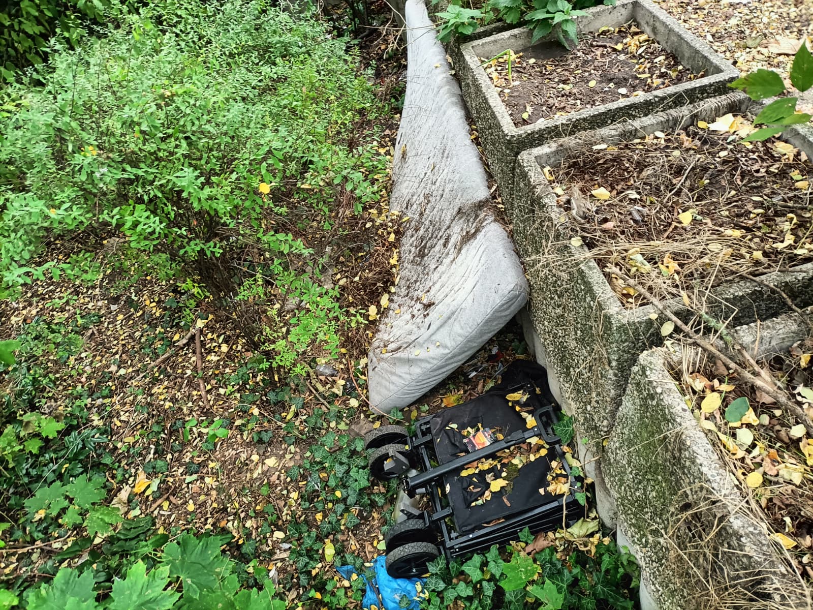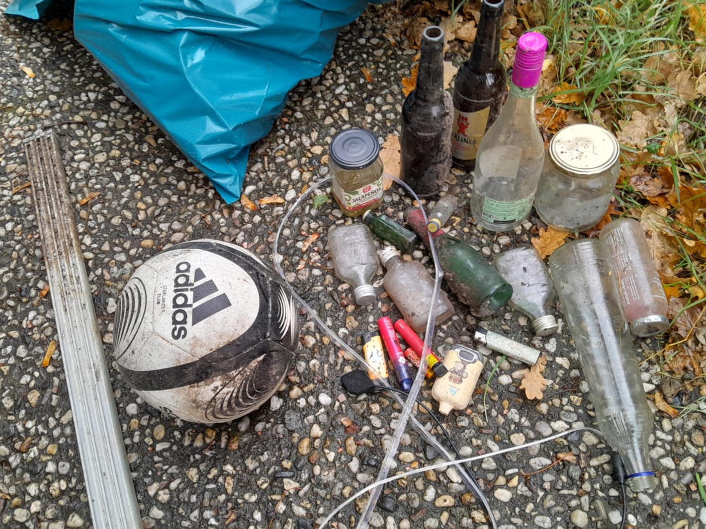 Bruchglas, Hundehalsband, Plastikbesteck, Sprühsahnedosen, Scheibenwischer, Holzbretter, Pappe, Powerbank-Anleitung, Flaschen, Staubsaugerteil, Elektroklappe, Turnschuh, Matratzenfedern, mehrere volle illegale Müllsäcke, Portemonnaie, aufgeschnittene Kabel, zwei ausgebrannte Motorroller, Bank, Bettkasten, Matratze, Autoteile, Reifen, unzählige Windeln, Spritzen, Insulinspritze, Fahrräder, Bauschutt, Klamotten, Bollerwagen, Stuhlbeine, Beton, Einkaufswagen, Wohnungstür – und noch vieles mehr.
