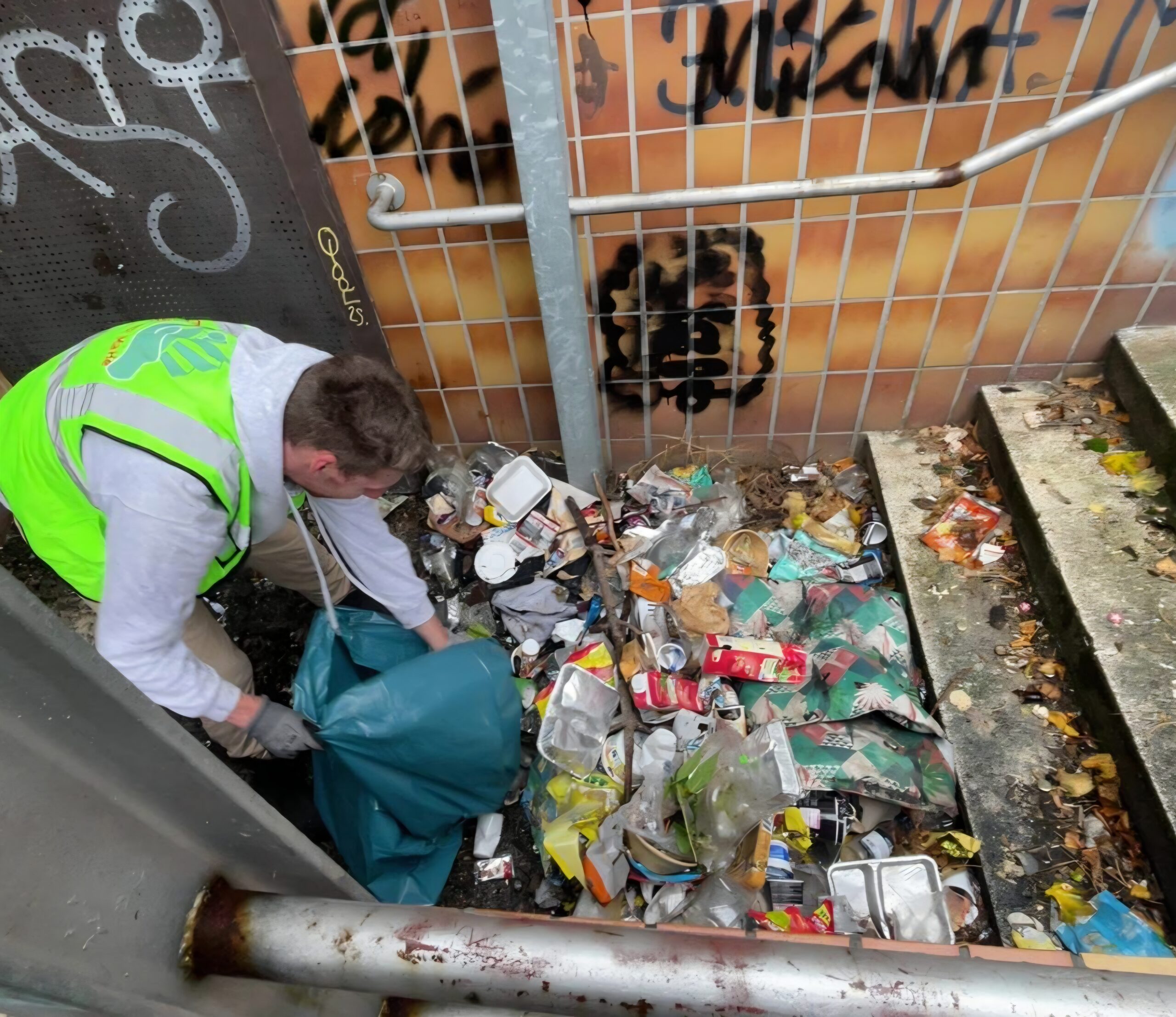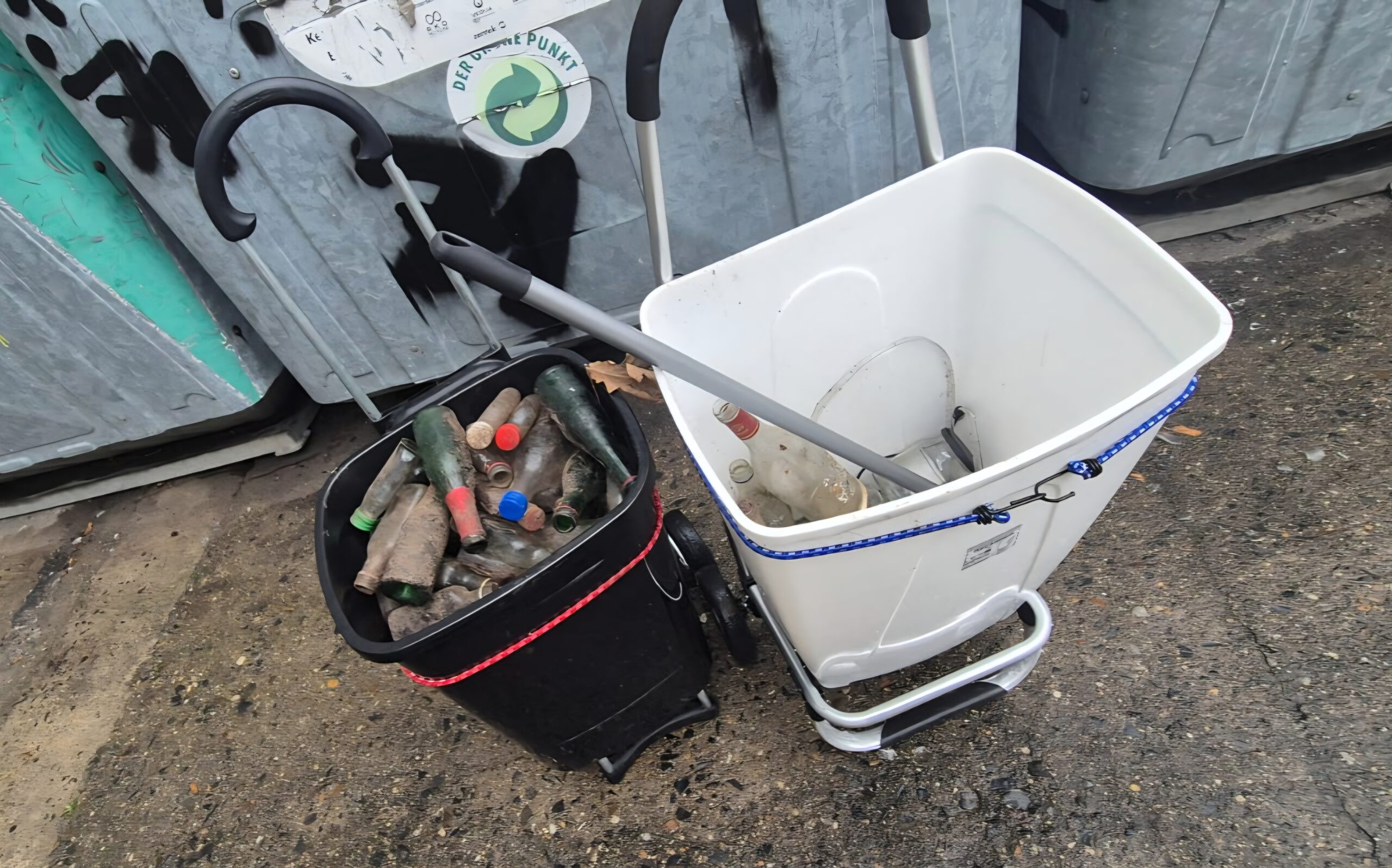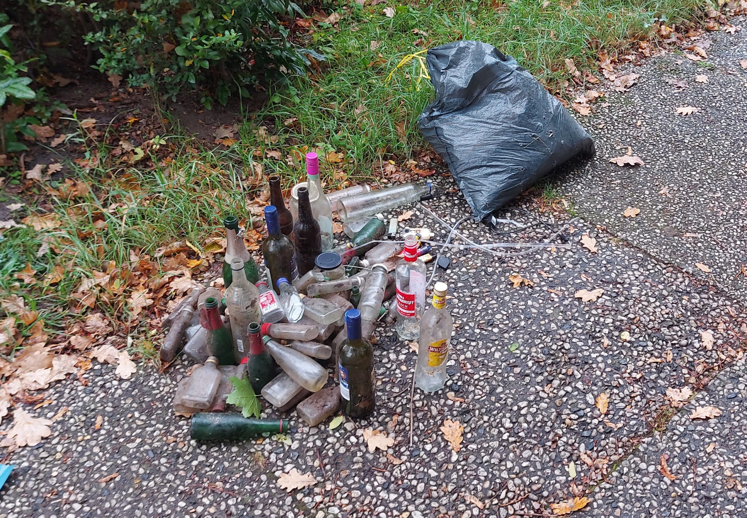 Dazu kamen Vapes, Kippen, Kronkorken, Plastikverpackungen und unzählige Glasflaschen, teils tief im Boden steckend.