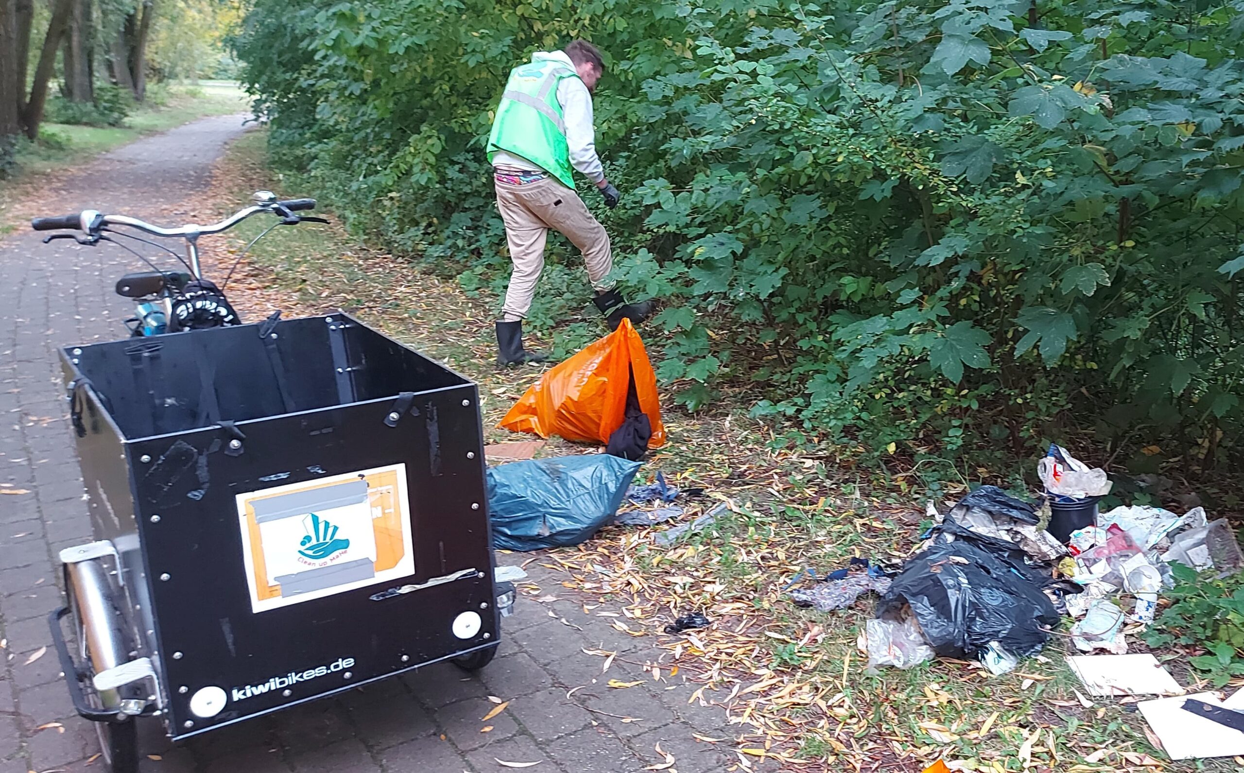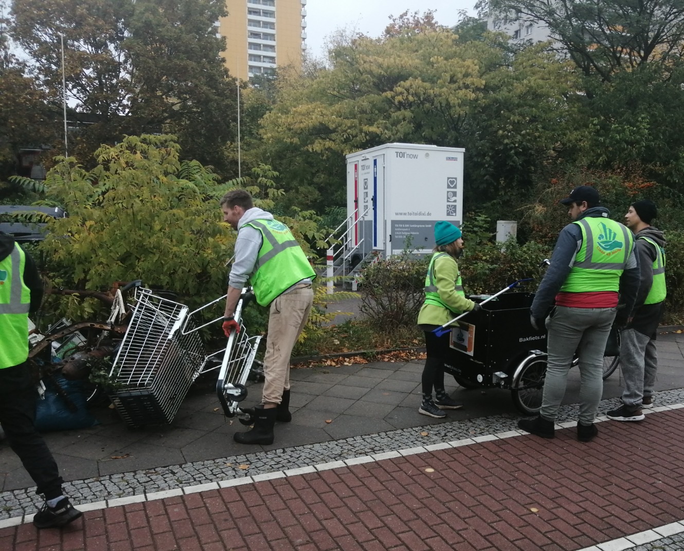 Wo wir vor drei Wochen bei strahlendem Sonnenschein begonnen hatten, setzten wir unsere Mission heute fort – diesmal bei Nieselregen, aber mit umso mehr Einsatzfreude. Mit 12,5 engagierten Menschen ging es rund um den Springpfuhl und die Haltestelle Helene-Weigel-Platz dem Müll an den Kragen.