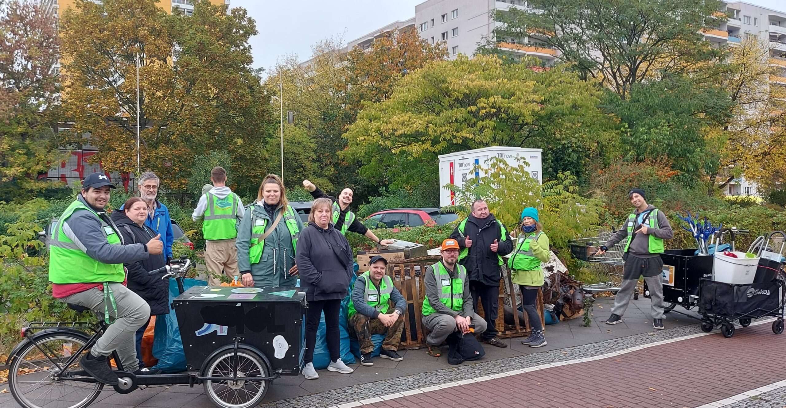 Wo wir vor drei Wochen bei strahlendem Sonnenschein begonnen hatten, setzten wir unsere Mission heute fort – diesmal bei Nieselregen, aber mit umso mehr Einsatzfreude. Mit 12,5 engagierten Menschen ging es rund um den Springpfuhl und die Haltestelle Helene-Weigel-Platz dem Müll an den Kragen.